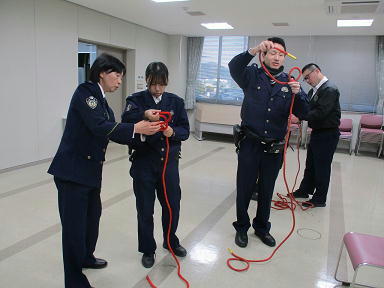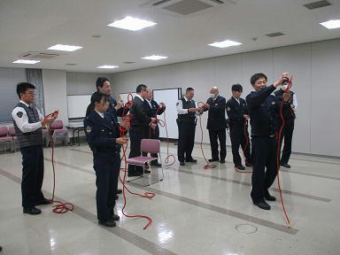 署員のスキルを生かし、教える側も教えられる側も成長することを目指すワンポイント講座を開催しています。今回は、機動隊での豊富な経験を有する署員を講師に、災害現場で役立つ「ロープワーク」を学んでいます。今後も多様な講座を開催し、署全体のレベルアップを図っていきます。