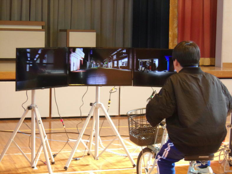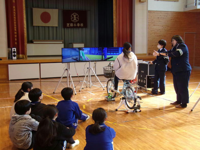 小松島市立芝田小学校で、春から中学生となり自転車通学を予定している6年生を対象に自転車の交通安全教室を開催しました。自転車シミュレーターを用いて、交通事故の多い場面について注意点を解説しながら訓練を行い、車から見た自転車の見え方なども体験しました。