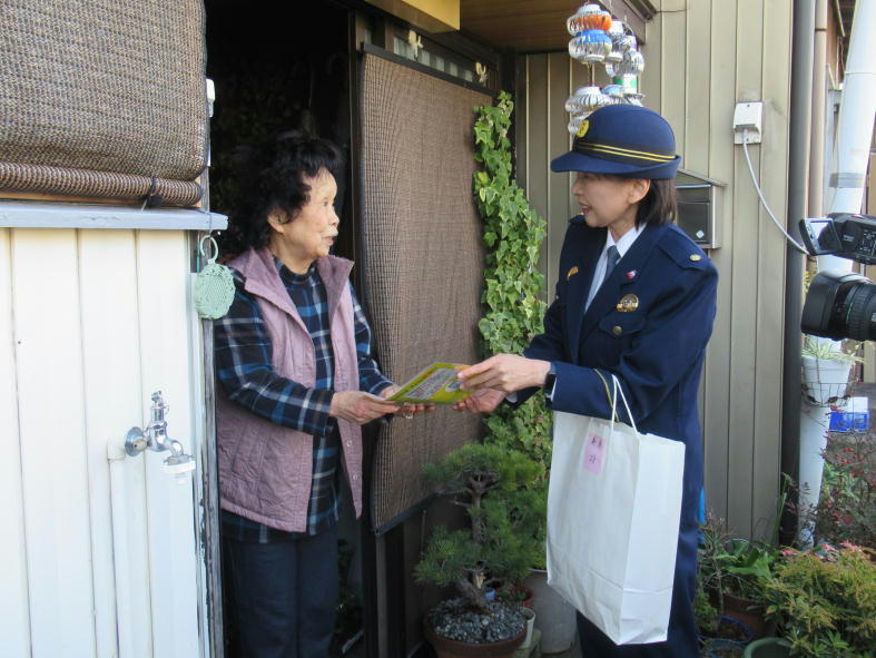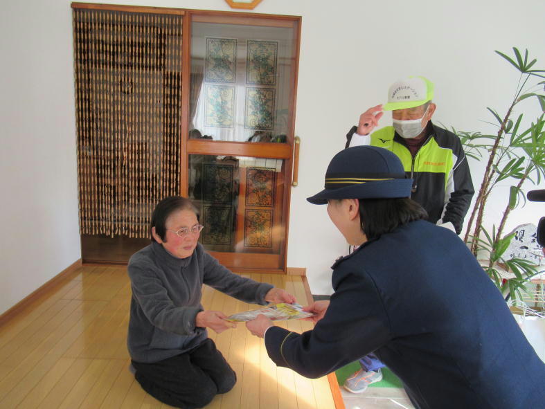 バレンタインデーに合わせ、北校区防犯交通地安推進会等の方々と一人暮らしの高齢者宅を訪問しました。小学生が書いた手紙にチョコレートを添えて「不審な電話や交通事故に気をつけて」などと特殊詐欺被害防止や交通安全を呼び掛けました。皆さんもチョコっとお気をつけください❤
