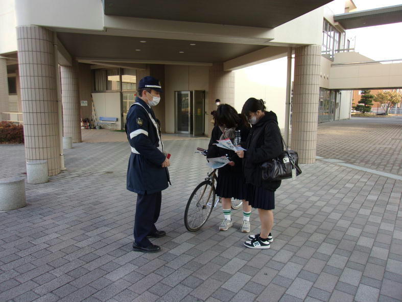 小松島高等学校で「自転車事故防止キャンペーン」を実施しました。自転車事故の多い登校時間帯に、自転車通学の高校生に「自転車乗車時のヘルメット着用」など自転車の安全な利用を呼び掛けました。