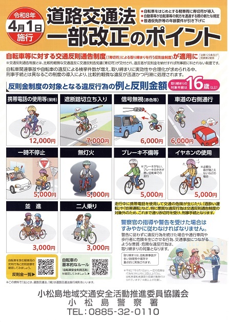 4月から自転車等に対する「青切符」による取締りを行う反則金制度が適用になります。自転車乗車時の安全運転をお願いします!