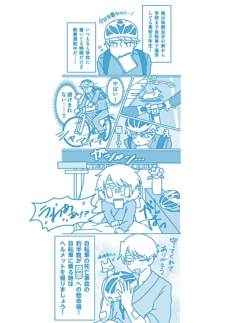 若手署員が、「自転車乗車時のヘルメット着用」を呼び掛けるマンガを作りました。