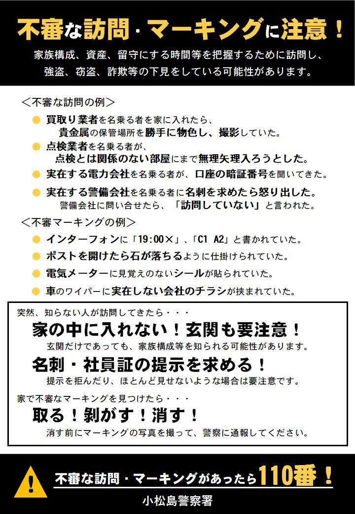 皆さん、知らない人が突然訪問してきたり、家で不審なマーキングを見つけたらどうしますか?それは犯罪の下見かもしれません。そんなときは迷わず110番!