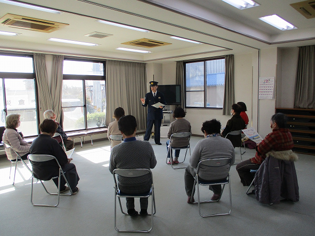 あかいし交番員が新開公民館で行われている「百歳体操」に参加の高齢者を対象に「防犯・交通事故防止講習」を行いました。
